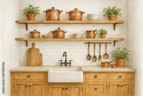Rustic kitchen with greenery and copper cookware on wooden shelves above farmhouse sink. concept of cozy home decor, culinary inspiration, natural kitchen design
