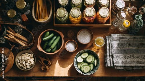 Rustic kitchen with preserved vegetables and fresh ingredients for organic home cooking