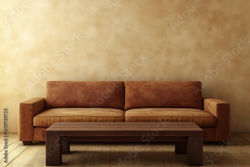 Rustic Living Room with Brown Leather Couch and Wooden Coffee Table