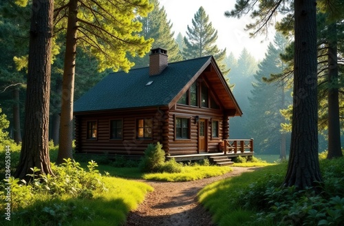 Rustic log cabin in sunlit forest clearing surrounded by tall pine trees