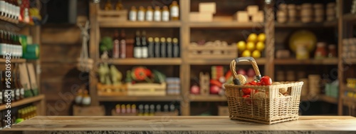 Rustic market scene with a basket of fresh produce on a wooden counter