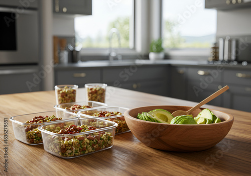 Rustic meal prep with nuts and avocado in portion boxes on modern kitchen wooden table