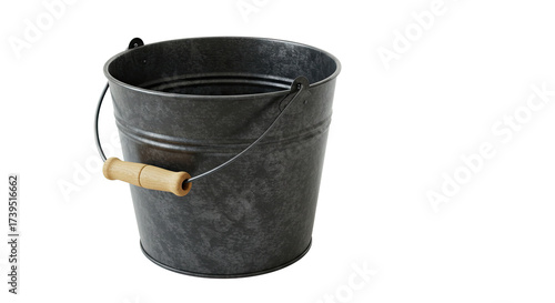 Rustic metal bucket with wooden handle for carrying water or other items.