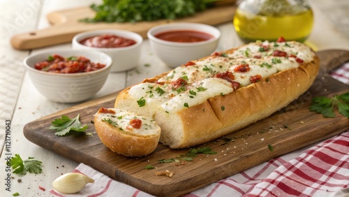 Rustic mozzarella stuffed bread with herbs on wooden board