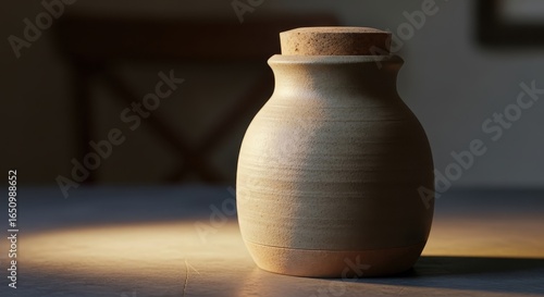 Rustic Pottery Jar A Simple Vessel with a Cork Top, Capturing Warm Light and Shadow