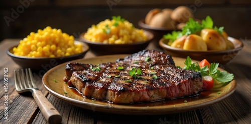Rustic Ranch-Style Feast Grilled Steak, Baked Potatoes, and Corn on the Cob served on a wooden table. Enjoy this wholesome and delicious traditional meal.