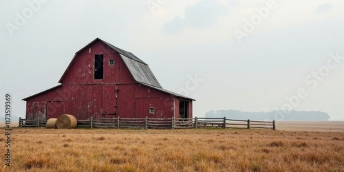 Rustic Red Barn in a Serene Autumnal Field with Hay Bales