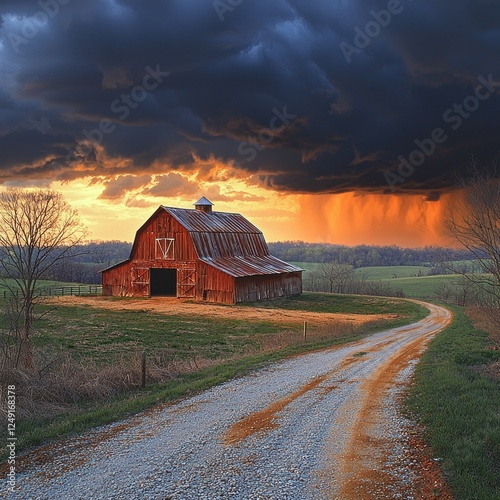 Rustic red barn under dramatic stormy sky at sunset with gravel road