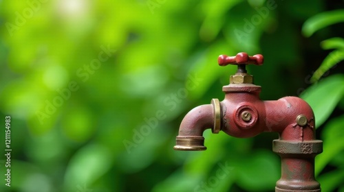 Rustic Red Faucet Against Vibrant Green Foliage, a Symbol of Freshness and Nature's Abundance