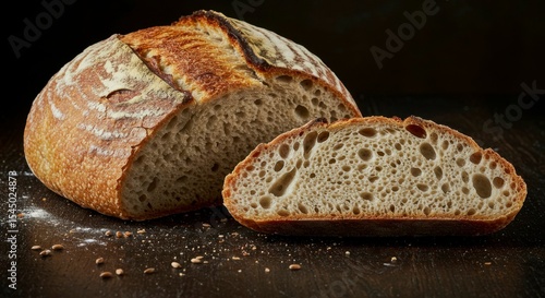 Rustic sourdough loaf, partially sliced, reveals airy crumb and flavorful crust. Dark wood background enhances its appeal