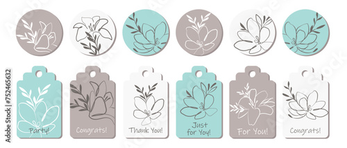 Rustic sticker set or greeting card template with outline flowers. Anniversary, birthday, wedding, party, social media banner set. Vector
