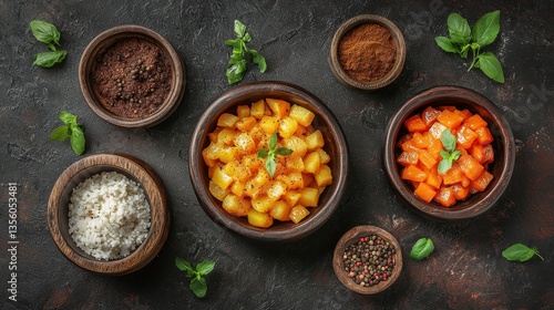 Rustic still life featuring vibrant bowls of ingredients and fresh herbs on dark backdrop