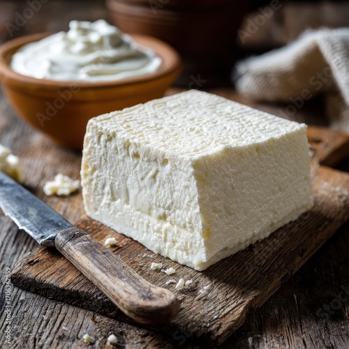 Rustic Still Life of Artisanal Crumbly White Cheese on a Wooden Cutting Board.