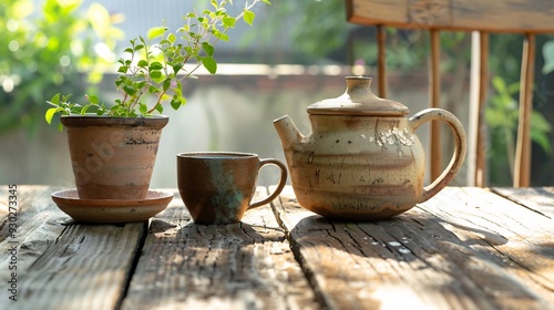 Rustic Tea Set on Weathered Wooden Table with Green Plant