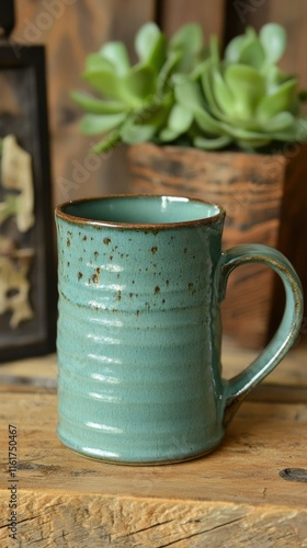 Rustic Teal Ceramic Mug On Wooden Surface