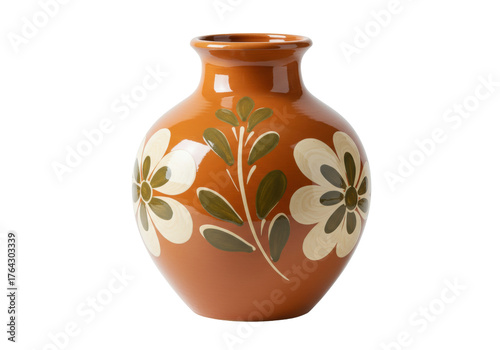 Rustic terracotta vase with floral design isolated on a clean background, decorative pottery for home decor and flower arrangements
