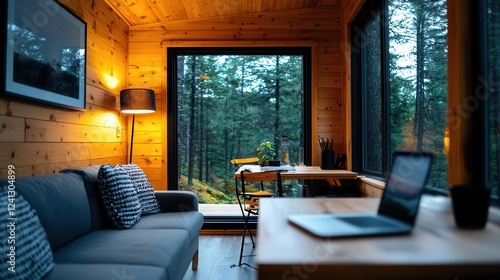 Rustic tiny cabin interior with compact wood furniture, cozy lighting, and smart storage solutions