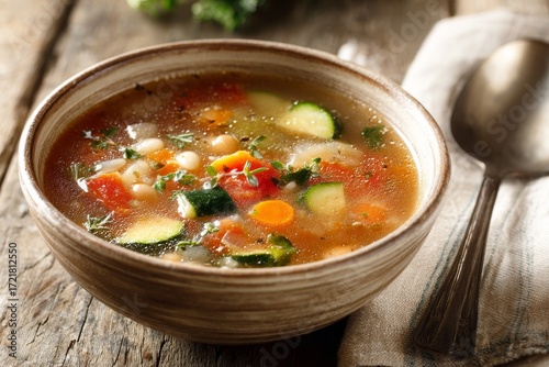 Rustic Vegetable Soup Bowl On Wood Table, Comfort Food, Healthy Eating, Close-up View, Warm And Nutritious Meal, Culinary Art, Vegan And Vegetarian Options Available