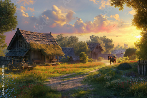Rustic Village at Sunrise with Cottages, Horse, and Lush Greenery