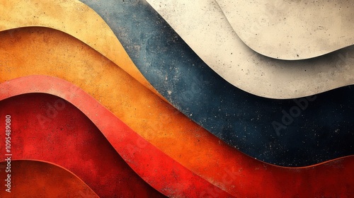Rustic wavy lines painted in red, yellow, and blue on weathered metal surface, abstract vintage design, textured pattern, retro style, industrial art, colorful grunge
