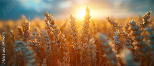 Rustic wheat field background with shallow depth of focus. Golden ears of grain on a meadow landscape, on a sunny day, with a blurred nature backdrop. A picnic or food concept. Vintage color tone.