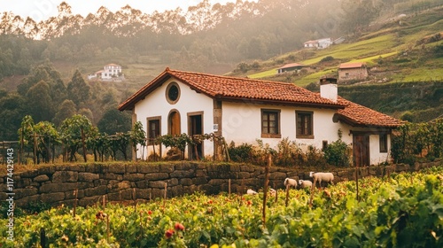 Rustic white house with red tile roof in a vineyard, sheep grazing, hilly landscape, sunset.