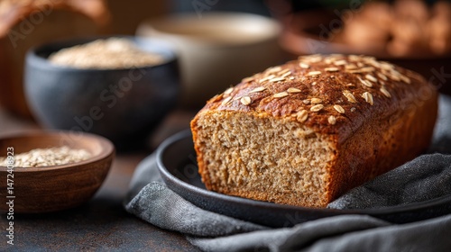 Rustic whole wheat bread with oats on gray plate in cozy kitchen setting.