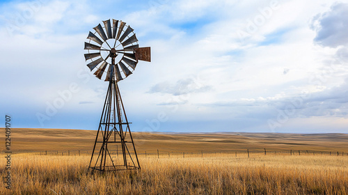 Rustic windmill standing tall in expansive prairie landscape under a dramatic sky, symbolizing rural life