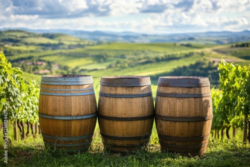 Rustic wine barrels surrounded by lush vineyards scenic landscape daylight viewpoint nature photography for wine enthusiasts