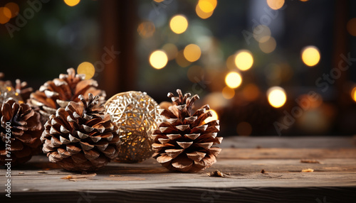 Rustic wood table adorned with glowing Christmas decorations and gifts generated by AI