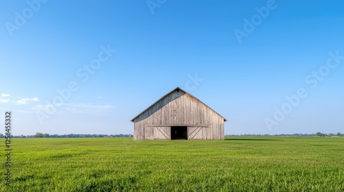 Rustic wooden barn in a grassy field under a clear sky. Ideal for agricultural or nature photography