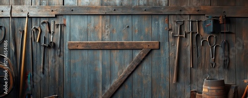 Rustic wooden barn wall with vintage farm tools hanging on hooks in a row