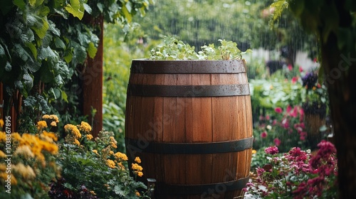 Rustic Wooden Barrel Collecting Rainwater Amidst a Lush Garden in Bloom