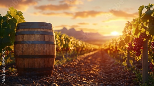 Rustic Wooden Barrel in Vineyard With Sunset Over Mountains