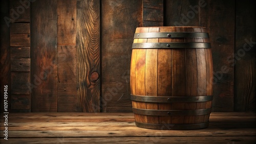 Rustic wooden barrel resting on aged planks against a backdrop of vertical wooden panels