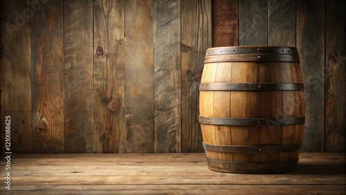 Rustic Wooden Barrel Resting on Aged Planks Against a Weathered Wooden Wall