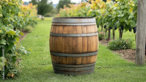 Rustic Wooden Barrel Surrounded by Lush Vineyard Rows and Grapes