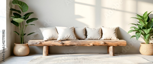 rustic wooden bench with beige cushions and potted plants