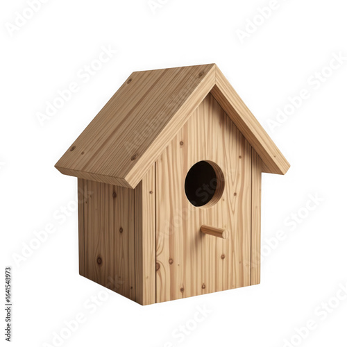 Rustic wooden birdhouse with a round entrance hole and perch isolated on transparent background