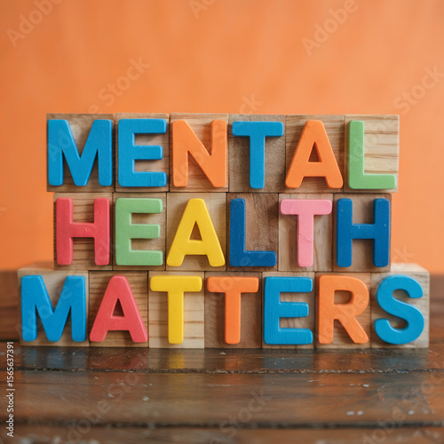 Rustic wooden blocks stacked vertically with colorful blue foam letters spelling “mental health matters” against a bold orange backdrop—uplifting, textured, and visually striking