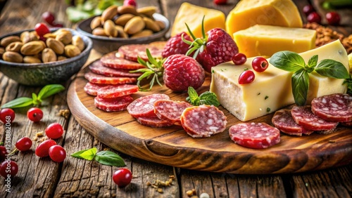 Rustic wooden board laden with gourmet cheeses, salami, juicy raspberries, olives, and crunchy almonds.