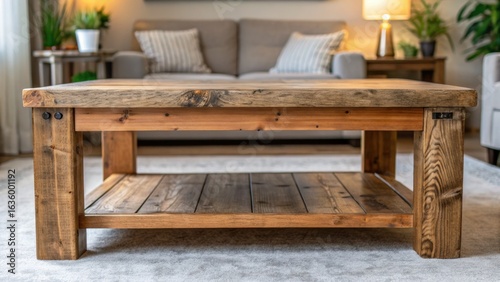 Rustic wooden coffee table in a cozy living room setting with plants and soft furnishings.