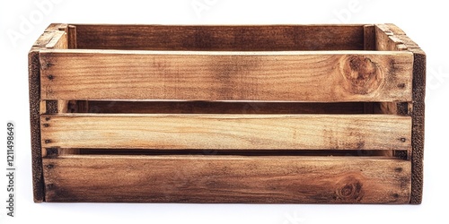 Rustic wooden crate with a natural finish positioned on a white background ideal for shipping or storage with an emphasis on texture and craftsmanship