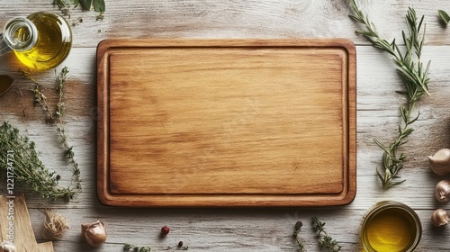 Rustic wooden cutting board, herbs, oil, recipe background