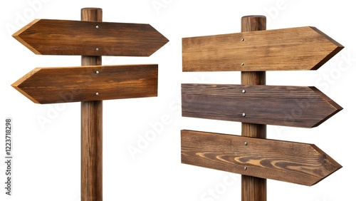 rustic wooden directional signs against a pure white background. The signs feature varying arrow configurations, one with a single arrow, another with two, and the last with three. Each sign is compos