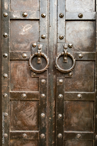 Rustic wooden doors with metal accents and large knockers in an ancient style located in a historic building