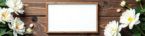 Rustic wooden frame, white card mockup, delicate white flowers , summer, craft, wooden