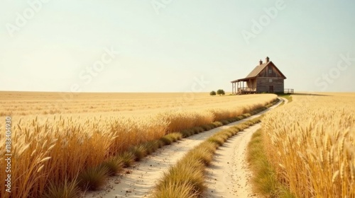 Rustic Wooden House on a Sandy Path Through Golden Wheat Field