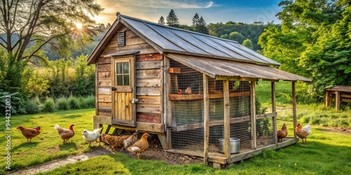 Rustic wooden poultry house with corrugated metal roof and wire mesh enclosure amidst lush greenery, surrounded by scattered feathers and farm equipment.