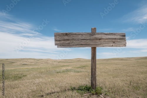 Rustic Wooden Sign Post on Open Grassland Under Blue Sky.